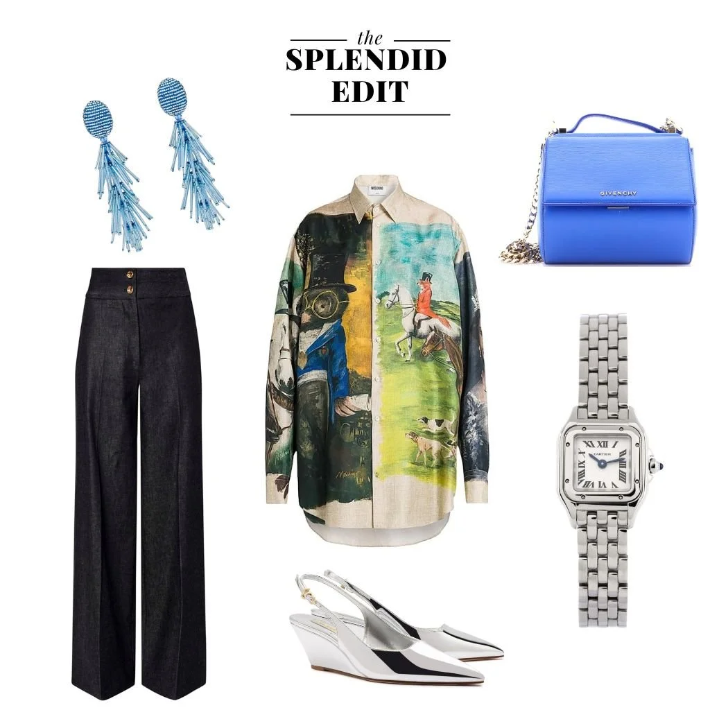 This printed silk twill blouse takes the show while pops of silver and blue play supporting roles to create an unforgettable look full of personality and sophisticated, luxury style. Carry the bag under your arm with the strap handing down for a nod to street style.